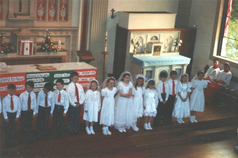 A first communion group, again do you know when and who? The people at the ends are of course Fr Pat and Mrs Pennington, it is the young people we are interested in.